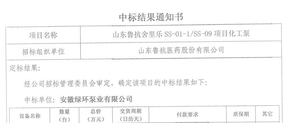 近日,我公司成功中標山東魯抗藥業化工泵招標項目,共計55臺化工泵。山東魯抗醫藥股份有限公司是我國大型的綜合化學制藥企業,國家重要的抗生素生產基地。魯抗醫藥A股(600789)股票于1997年2月在上海證券交易所掛牌上市。總資產25億元,員工5700多人。 魯抗的前身濟寧抗生素廠,創建于1966年。本次綠環泵業成功中標化工泵項目,標志著綠環品質得到了廣大用戶的認可。