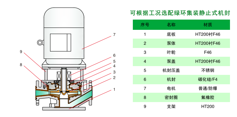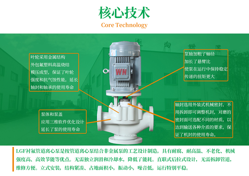 LGF型立式襯氟管道泵是為滿足用戶腐蝕性流體管道增壓而設計的一款耐酸泵,該泵所有核心組件與IHF離心泵通用,采用模塊化設計 ,泵體法蘭采用平進平出的設計,電機和泵的聯接為全系列直聯式結構,泵的過流部件全部采用襯氟材質,機械密封標配采用外裝式單端面機封,可輸送各類強酸清液,還可根據用戶要求定制耐顆粒型集裝式機封。