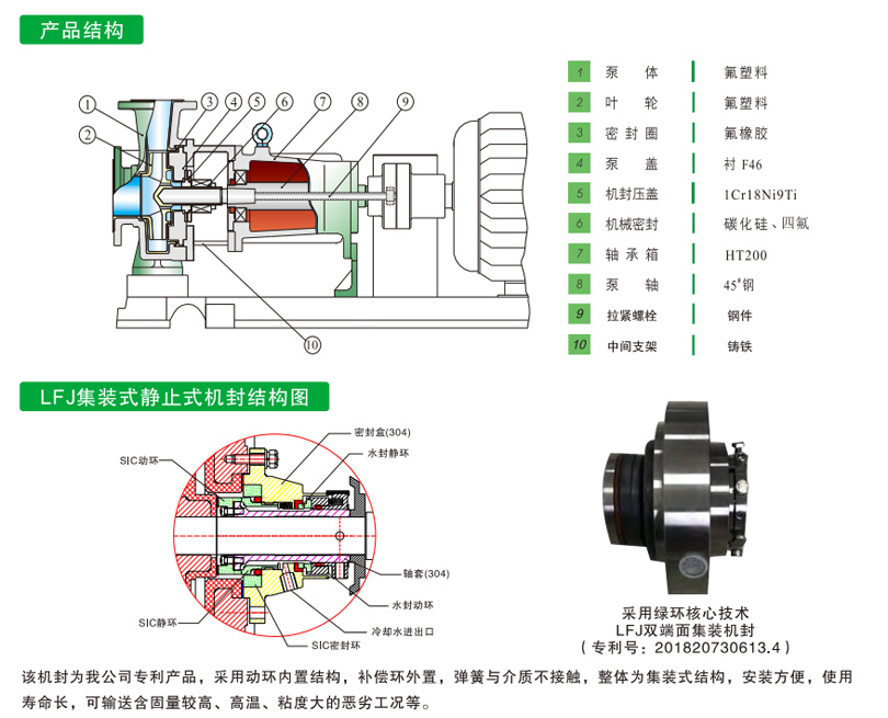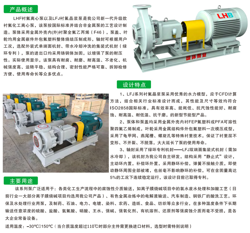 LFJ襯氟晶漿泵是在原LHF泵基礎(chǔ)上升級而來,通過改變?nèi)~輪、泵蓋、機封等部件,使整個系列的泵完全升級,可用于輸送任意濃度的酸堿,并且可輸送的介質(zhì)中可能含有細小的顆粒或結(jié)晶,該泵機封采用綠環(huán)獨有的創(chuàng)新技術(shù)--LFJ雙端面集裝機封。
