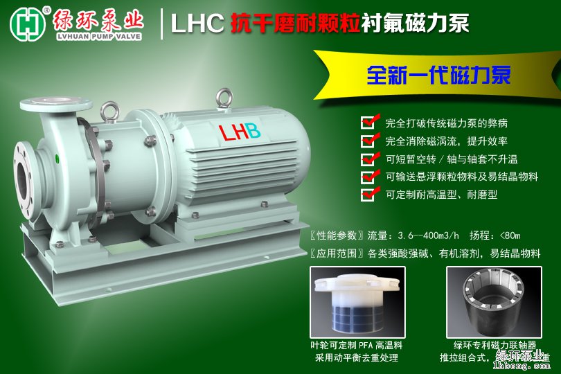 綠環近年來研發的LHC系列襯氟磁力泵,可以輸送含少量固體顆粒的物料,其原理是采用了部分改性材料以及優化了內部結構。感興趣的朋友,可以看看相關介質。