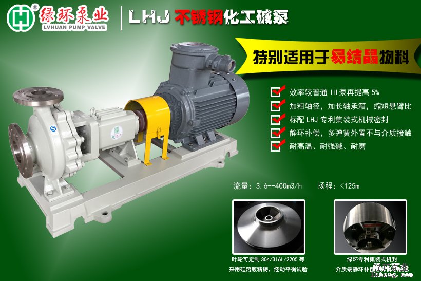 產品概述: LHJ化工流程離心堿泵(簡稱LHJ堿泵)屬單級單吸懸臂式離心泵,在IH泵的基礎上升級創新而成,是替...